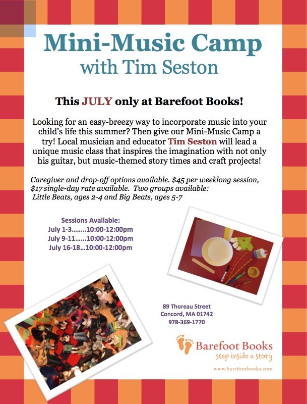 | Thank you for you interest in Tim's stories and songs. At Home: anytime you want on Facebook at From Page To Play videos Barefoot Books Mini-Music Camp - Tim has teamed up with the Flagship Store in Concord to share songs, stories and crafts for nine days over three weeks this July. See the flyer below for dates and prices. Contact the store at 978-369-1770 to pre-register. Cape Cod Children's Museum: It is Mashpee Pirate Palooza Weekend. On Saturday, July 13th at the museum,Tim will be sharing his version of Robert Louis Stevenson's Treasure Island. The performance is most appropriate for children age 4 and older. Tim will be doing multiple shows - check back for exact times. |